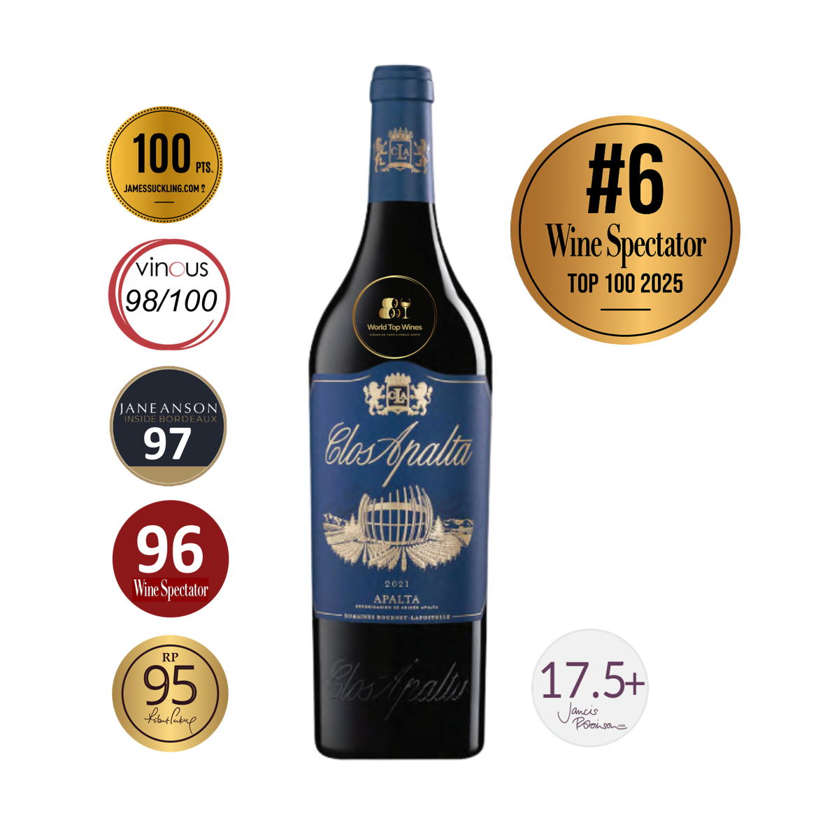 Clos Apalta 2021 is the icon of the Bournet-Lapostolle family in the Colchagua Valley, born from old Cabernet Sauvignon and Carmenère vines in an amphitheatre facing the Tinguiririca River. The property was purchased in 1994 by Alexandra Marnier-Lapostolle. In 2025, Clos Apalta 2021 was ranked No. 6 in Wine Spectator's Top 100, making it into the Top 10