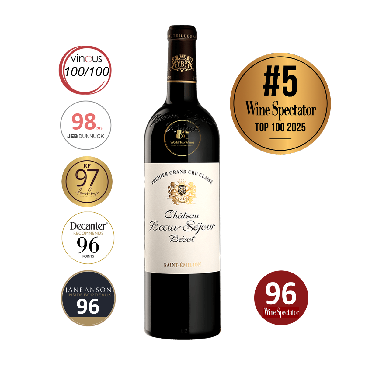 Château Beau-Séjour Bécot 2022 is a Saint-Émilion Premier Grand Cru Classé B, located on the limestone plateau of Saint-Martin de Mazerat and now run by Juliette Bécot and Julien Barthe. The origins of the terroir date back to medieval monks, then to the work of Michel Bécot, who consolidated the property's international reputation. In 2025, Beau-Séjour Bécot 2022 was ranked No. 5 in Wine Spectator's Top 100, entering directly into the coveted Top 10