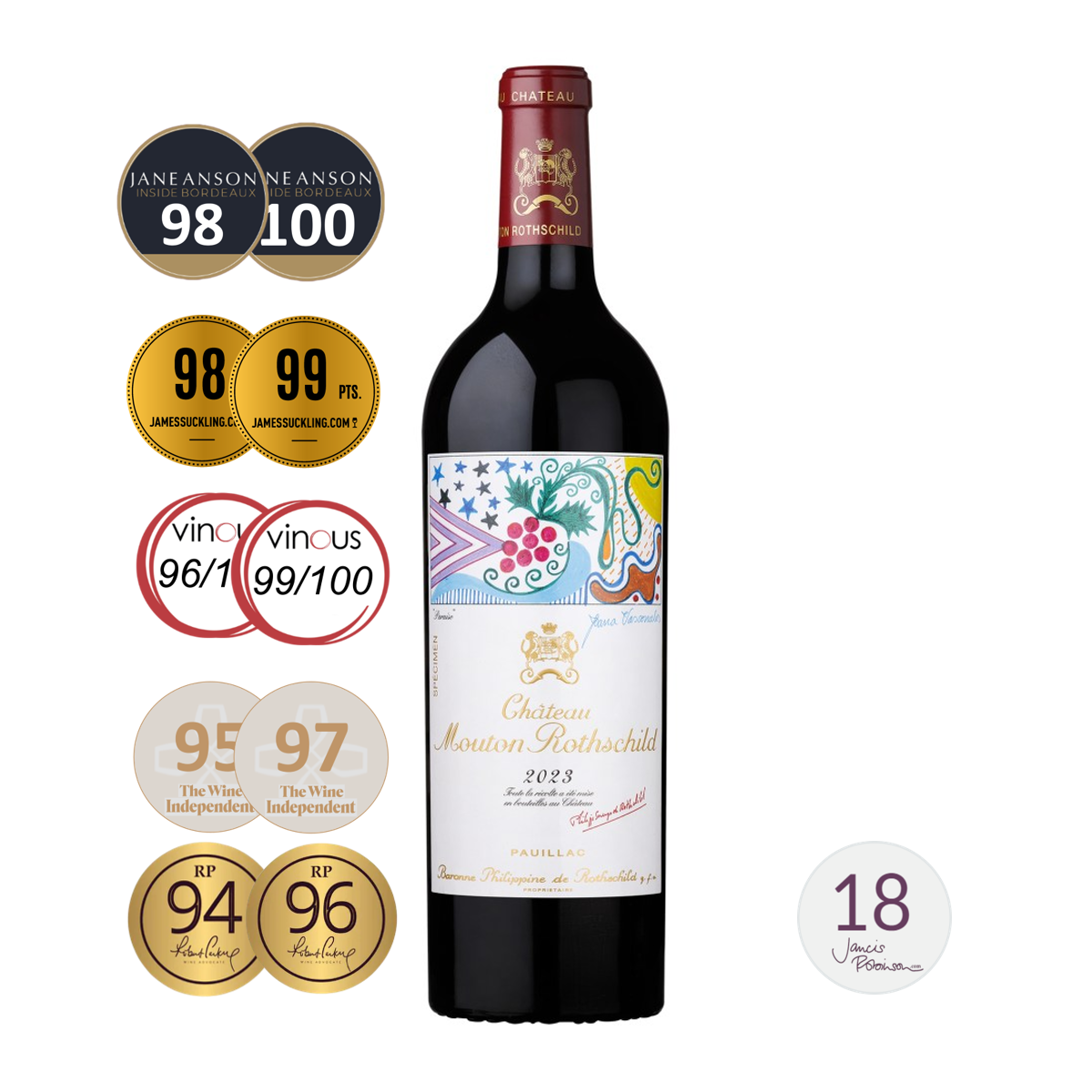Aromas de crème de cassis e bagas escuras misturados com lápis de barbear, torrefação de café expresso e violetas introduzem o Mouton Rothschild 2023, um vinho de corpo médio a encorpado, em camadas e carnudo, com um núcleo cremoso de fruta madura mas viva, taninos doces e um final expansivo. Em termos de parcelas, o 2023 tem origens bastante diferentes do 2022, favorecendo parcelas com melhor drenagem em vez de parcelas resistentes à seca. É uma mistura de 93% Cabernet Sauvignon e 7% Merlot, sem Cabernet Franc ou Petit Verdot na mistura, e atingiu 13,3% de álcool.