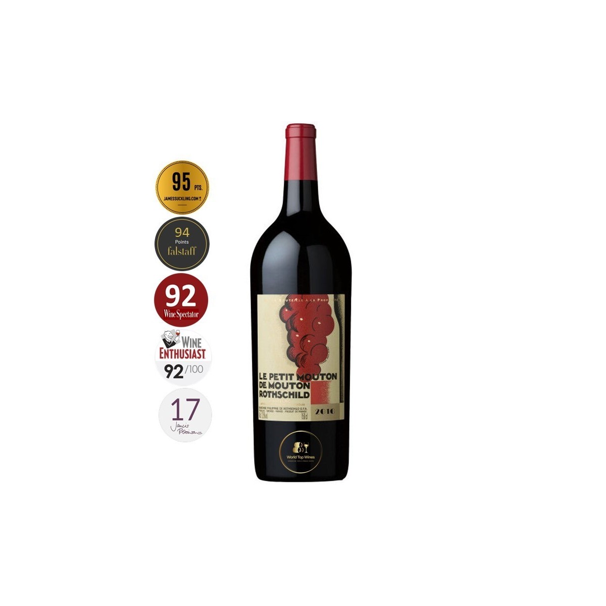 Le Petit Mouton de Mouton Rothschild 2016 é o segundo vinho do prestigiado Château Mouton Rothschild, situado em Pauillac. Proveniente de um ano excecional, marcado por um verão seco e ensolarado que originou bagas pequenas e muito concentradas. Revela uma expressão poderosa, elegante e moderna. Apresenta uma estrutura densa e refinada, com aromas profundos de fruta negra, notas tostadas e especiadas, refletindo o estilo preciso e concentrado típico de Pauillac e a filosofia de vinificação de excelência do Château. Harmonioso e já equilibrado, possui excelente potencial de guarda.
